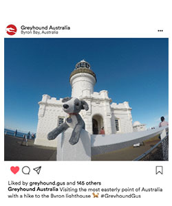 1. To be eligible to enter the promotion, entrants are required to post a photo of Greyhound Gus to Instagram using the hashtag #GreyhoundGus and tagging the Greyhound Australia Instagram account @greyhoundaustralia. Each entrant can enter as many times as they like. Greyhound Gus will be available to meet at Greyhound Australia Travel Centres, the Greyhound Freight depot in Broome, Greyhound Australia Head Office, and on selected Greyhound services.